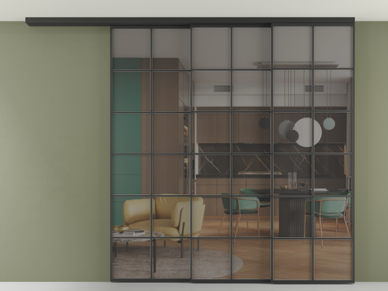 Во всех алюминиевых перегородках, независимо от типа установки, используется компланарный раздвижной механизм, благодаря которому декоративная крышка и полотно находятся в одной плоскости.
