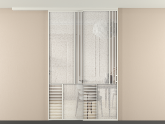 Дополнительно на раздвижную двустворчатую перегородку вдоль стены и четырехстворчатую перегородку внутри проема с двумя неподвижным полотнами можно установить механизм синхронного открывания — при открывании одной створки, вторая открывается автоматически.