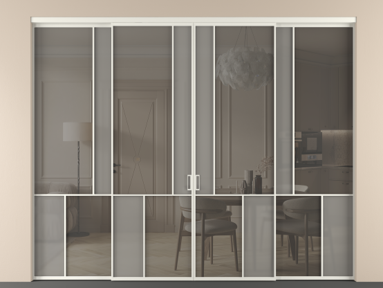 Дополнительно на раздвижную двустворчатую перегородку вдоль стены и четырехстворчатую перегородку внутри проема с двумя неподвижным полотнами можно установить механизм синхронного открывания — при открывании одной створки, вторая открывается автоматически.
