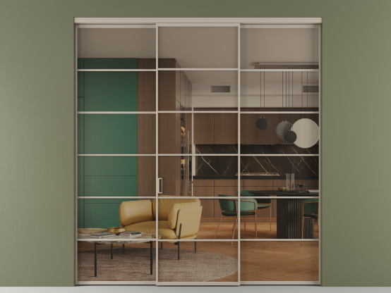 Алюминиевые перегородки имеют единый профиль с алюминиевыми дверьми и легко сочетаются в одном пространстве, не перегружая его. Также их можно комбинировать в интерьере с полотнами из нашего стандартного ассортимента. Помимо этого, система алюминиевых перегородок и дверей координируется со стеновыми панелями Волховец.