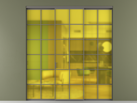Во всех алюминиевых перегородках, независимо от типа установки, используется компланарный раздвижной механизм, благодаря которому декоративная крышка и полотно находятся в одной плоскости.
