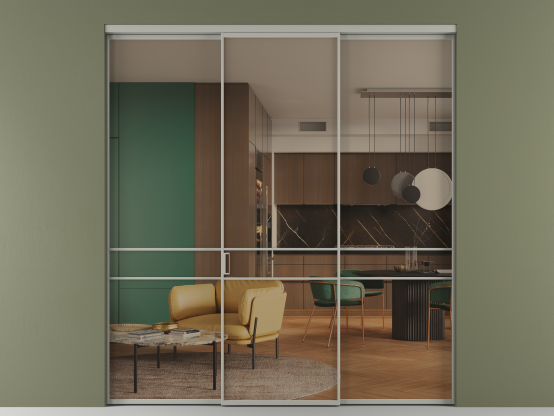 Алюминиевые перегородки имеют единый профиль с алюминиевыми дверьми и легко сочетаются в одном пространстве, не перегружая его. Также их можно комбинировать в интерьере с полотнами из нашего стандартного ассортимента. Помимо этого, система алюминиевых перегородок и дверей координируется со стеновыми панелями Волховец.