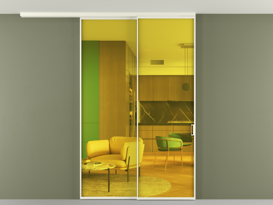Мы предлагаем девять вариантов декоративного стекла: от кристально-прозрачного до матовых цветных, а также стёкла с эффектом Stopsol, когда лицевая сторона стекла зеркальная, но при включенном освещении за стеклом — становится прозрачной.