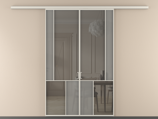 Во всех алюминиевых перегородках, независимо от типа установки, используется компланарный раздвижной механизм, благодаря которому декоративная крышка и полотно находятся в одной плоскости.
