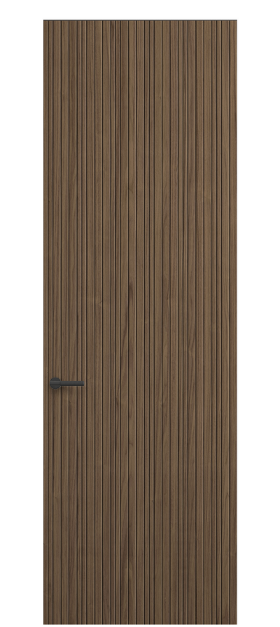 SELECT — коллекция минималистичных дверей с фрезеровкой по натуральному шпону. Рельеф на поверхности полотна создаёт игру света и тени, добавляя пространству динамичности и визуального объёма. Двери SELECT в сочетании со стеновыми панелями и мебельными фасадами, повторяющими лаконичный дизайн, создают единое стилевое решение.