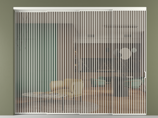 Дополнительно на раздвижную двустворчатую перегородку вдоль стены и четырёхстворчатую перегородку внутри проёма с двумя неподвижным полотнами можно установить механизм синхронного открывания — при открывании одной створки, вторая открывается автоматически.