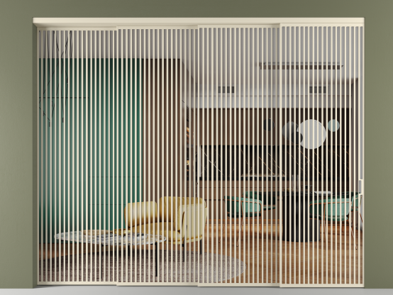 Дополнительно на раздвижную двустворчатую перегородку вдоль стены и четырёхстворчатую перегородку внутри проёма с двумя неподвижным полотнами можно установить механизм синхронного открывания — при открывании одной створки, вторая открывается автоматически.