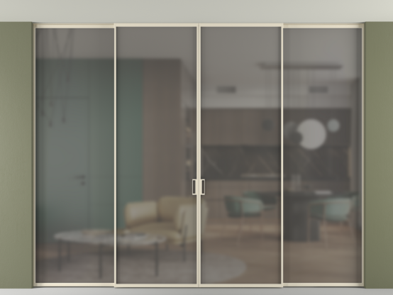 Дополнительно на раздвижную двустворчатую перегородку вдоль стены и четырёхстворчатую перегородку внутри проёма с двумя неподвижным полотнами можно установить механизм синхронного открывания — при открывании одной створки, вторая открывается автоматически.