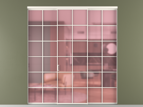 Дополнительно на раздвижную двустворчатую перегородку вдоль стены и четырёхстворчатую перегородку внутри проёма с двумя неподвижным полотнами можно установить механизм синхронного открывания — при открывании одной створки, вторая открывается автоматически.