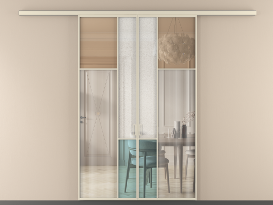 Дополнительно на раздвижную двустворчатую перегородку вдоль стены и четырехстворчатую перегородку внутри проема с двумя неподвижным полотнами можно установить механизм синхронного открывания — при открывании одной створки, вторая открывается автоматически.