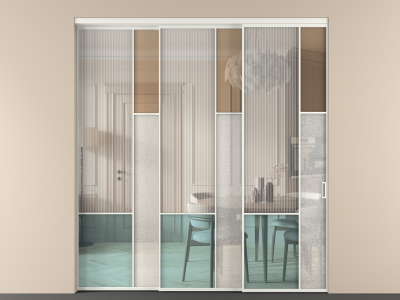 Дополнительно на раздвижную двустворчатую перегородку вдоль стены и четырехстворчатую перегородку внутри проема с двумя неподвижным полотнами можно установить механизм синхронного открывания — при открывании одной створки, вторая открывается автоматически.