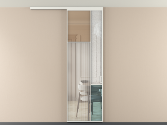 Во всех алюминиевых перегородках, независимо от типа установки, используется компланарный раздвижной механизм, благодаря которому декоративная крышка и полотно находятся в одной плоскости.