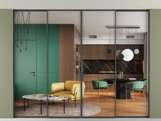 Алюминиевые перегородки имеют единый профиль с алюминиевыми дверьми и легко сочетаются в одном пространстве, не перегружая его. Также их можно комбинировать в интерьере с полотнами из нашего стандартного ассортимента. Помимо этого, система алюминиевых перегородок и дверей координируется со стеновыми панелями Волховец.